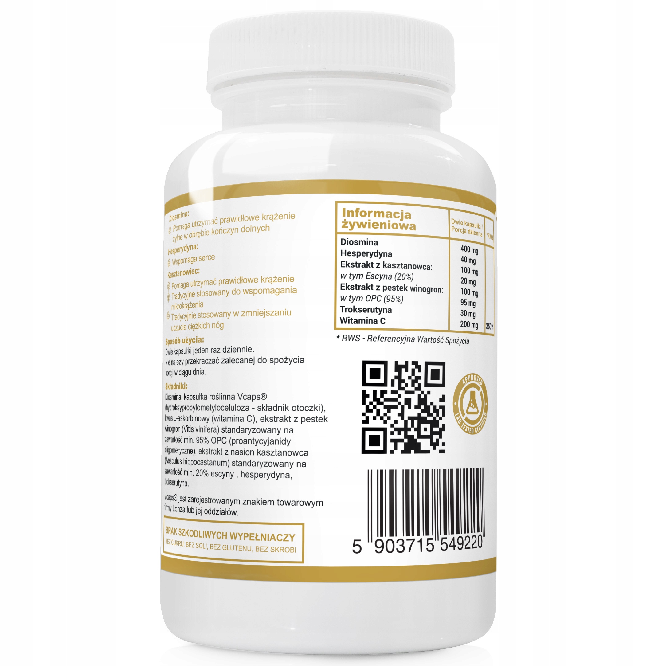 Składniki w 2 kapsułkach/ porcja dzienna: diosmina 400 mg, hesperydyna 40 mg, ekstrakt z kasztanowca 100 mg, w tym escyna 20 mg, ekstrakt z pestek winogron 100 mg, w tym OPC 95 mg, trokserutyna 30 mg, witamina C 200 mg (250%*)