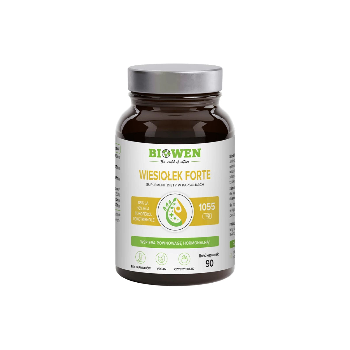 Wiesiołek Forte Biowen to suplement diety w kapsułkach zawierający naturalny olej z nasion wiesiołka dwuletniego, tłoczony na zimno i zamknięty w wegańskiej otoczce z tapioki. Produkt stanowi źródło nienasyconych kwasów tłuszczowych, w tym 85% kwasu linolowego (LA) i 10% kwasu gamma-linolenowego (GLA), które wspierają prawidłowe funkcje organizmu. W szczególności: